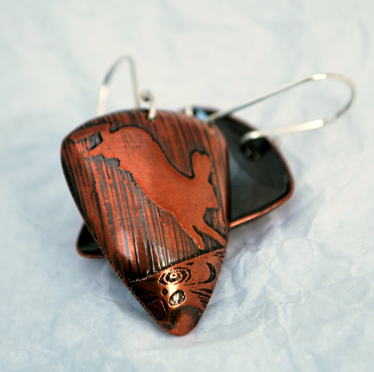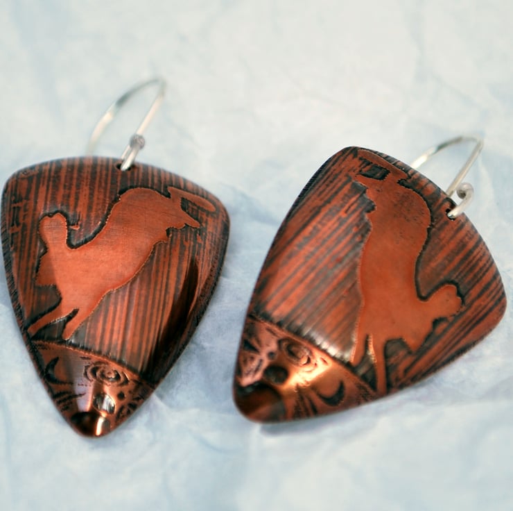 Exquisitely etched copper earrings with a leaping hare motif in a swirling, patterned stylized landscape. The have been domed into a triangular shape, then oxidised to sanded to emphasise the image before being polished to a super shine. Earwires are sterling silver.