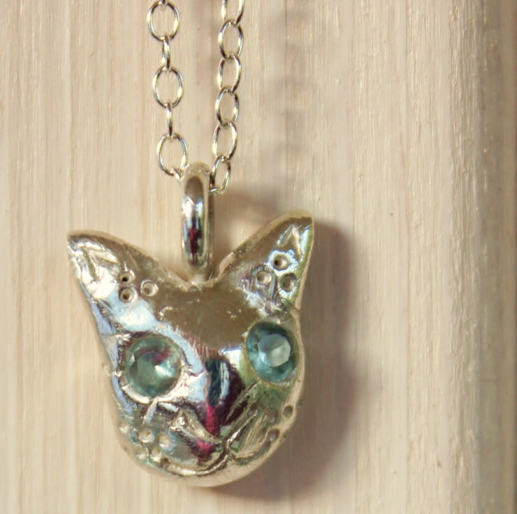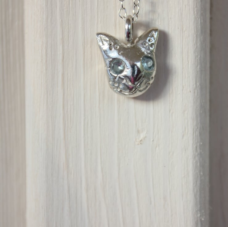 A gorgeous little silver cats face set with 2 gemstone eyes and dotty whisker detail.