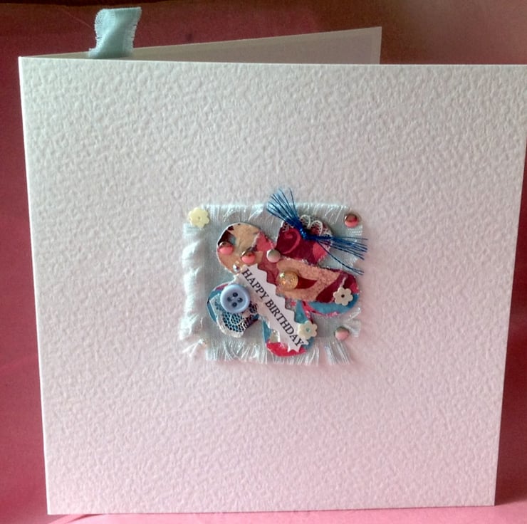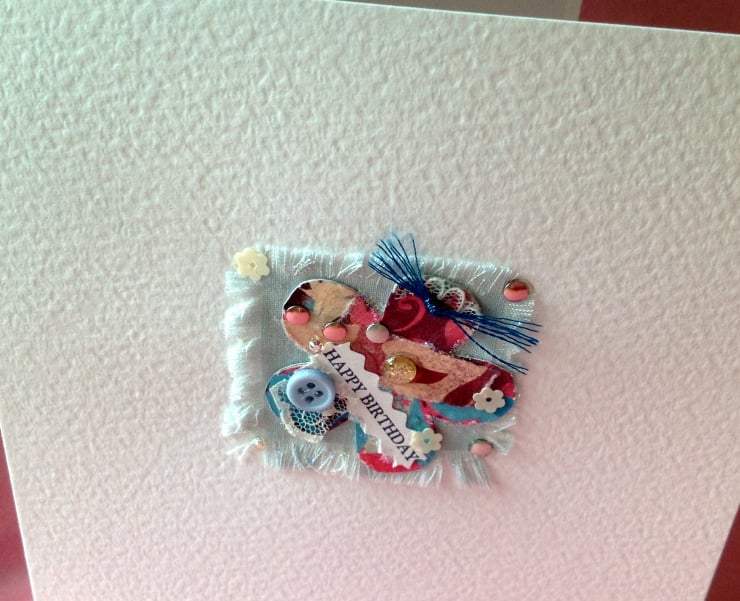 The main design is a cut out shape of a flower from a piece of my own handmade collaged card which is then placed on a pretty fabric frayed square.
