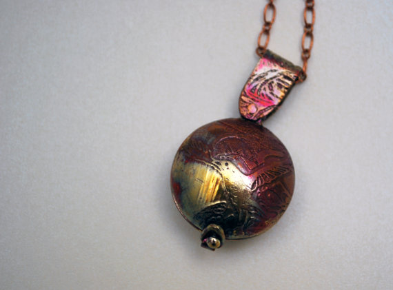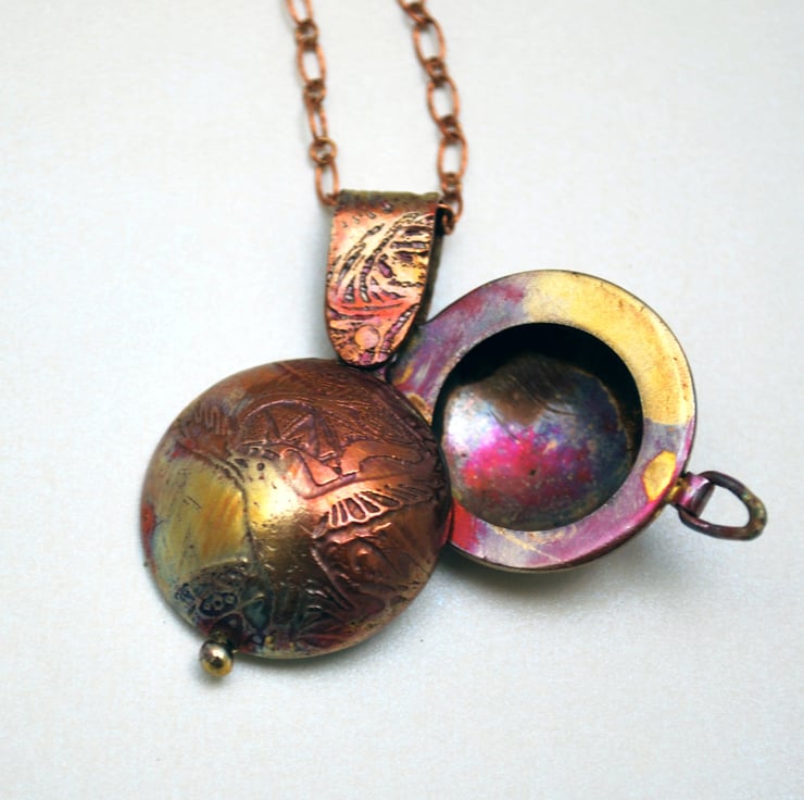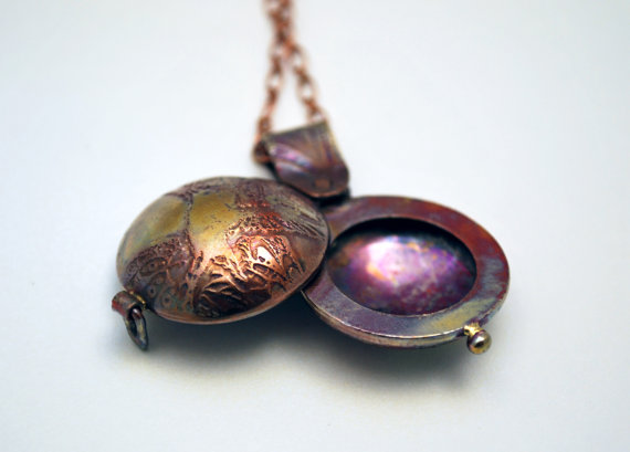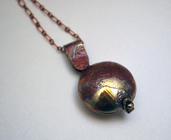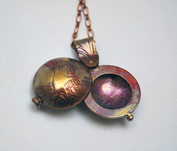 This Copper owl locket has an etched owl design on both sides of this swivel opening piece. The two domed copper sides of this copper swivel locket have been chemically etched using environmentally friendly techniques: The original image is drawn by hand or by using a graphics tablet to draw straight into CAD form and then manually transferred to the metal as a resist and etched. I then cut, form and polish by hand.