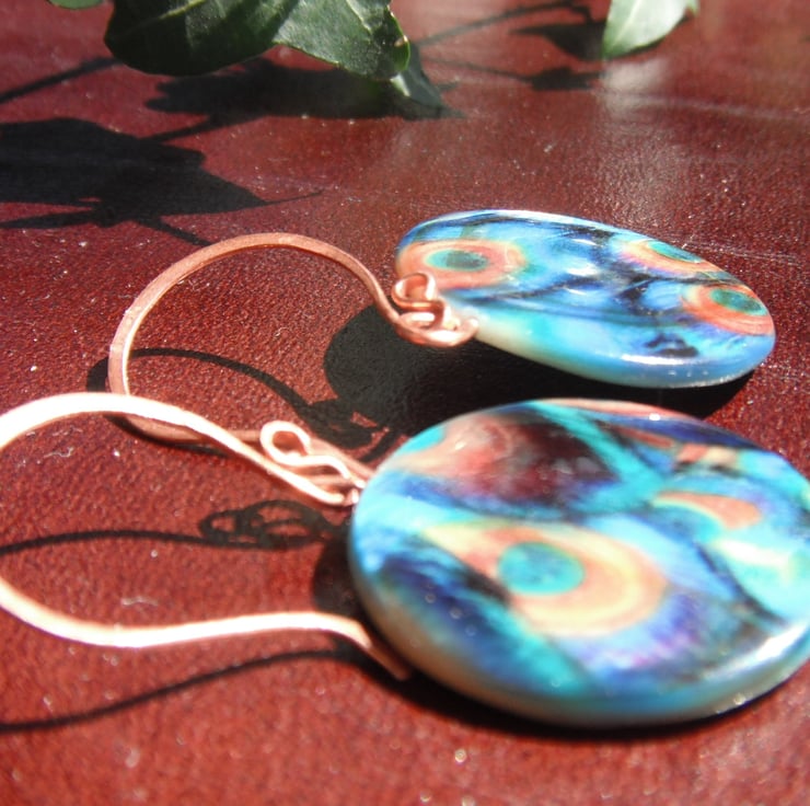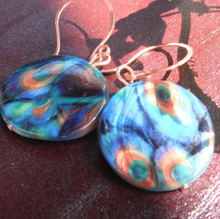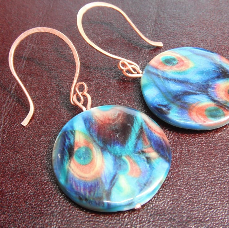 Gorgeous paua shell disc beads, with a truly beautiful peacock design. Suspended on up-cycled, hand forged copper wire ear wires.