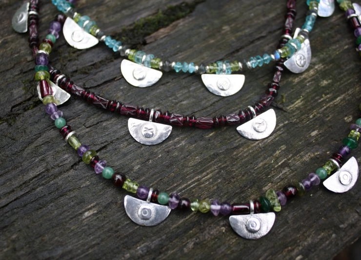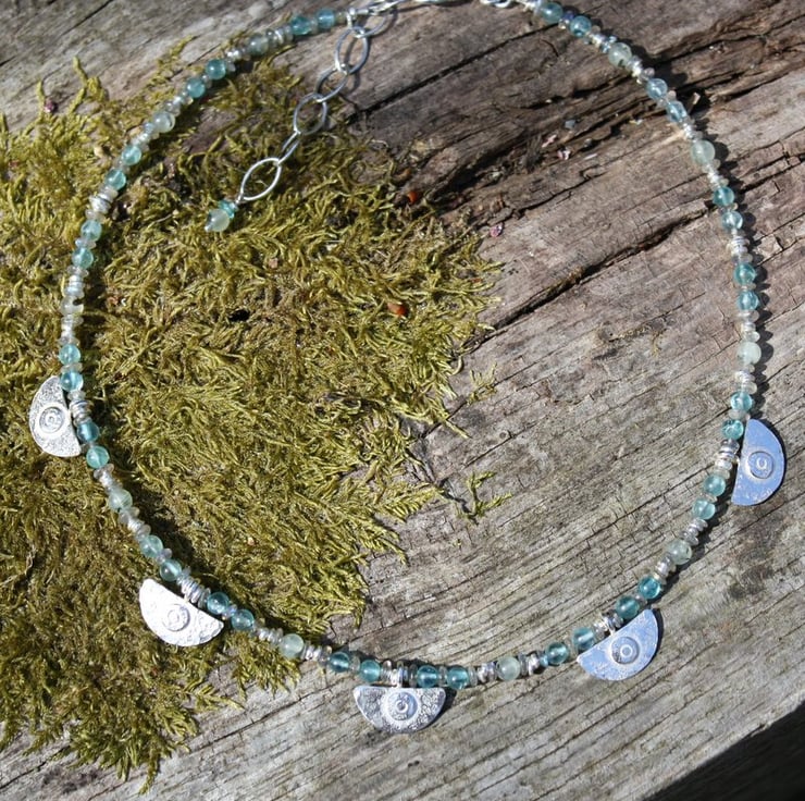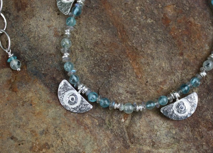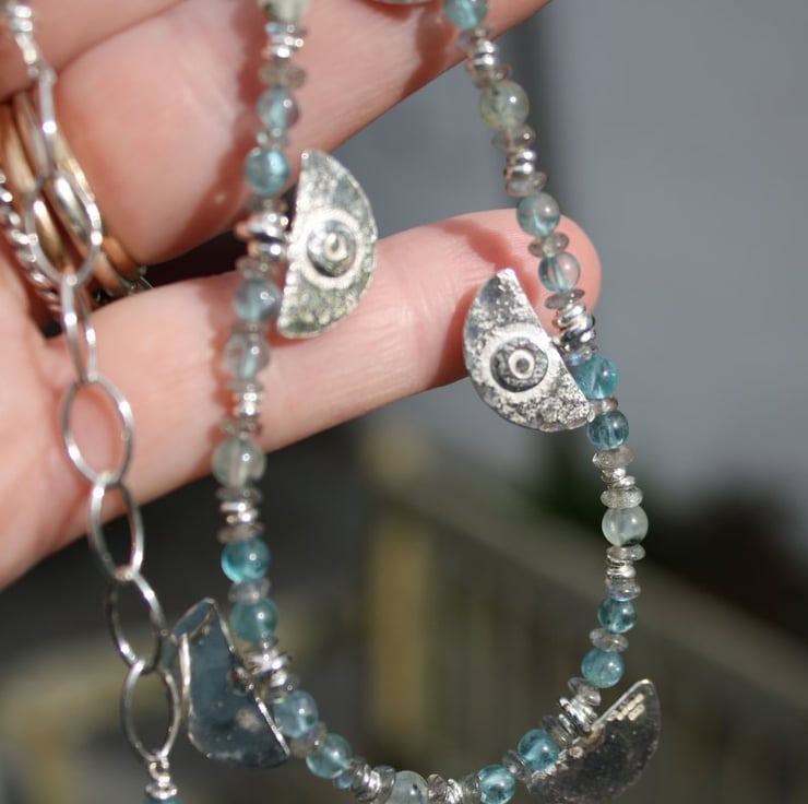 Gorgeous sea colour gemstones are combined with my fused and beaten silver beads to make this striking necklace.