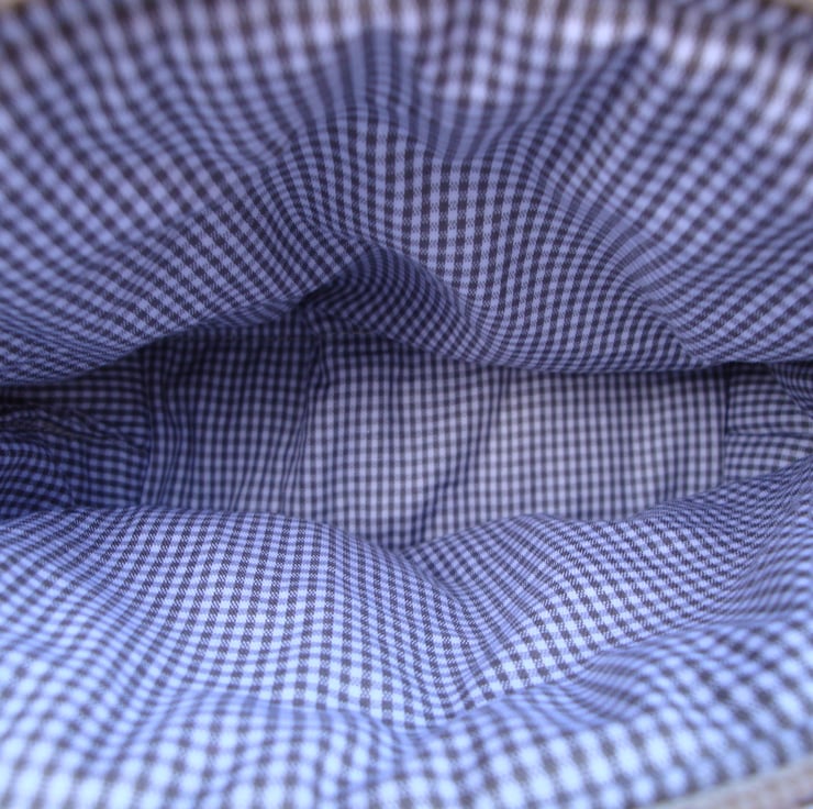 Bag has got a flat bottom, and both external / lining fabric has been mounted to backing fabric , for body and strength.