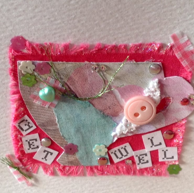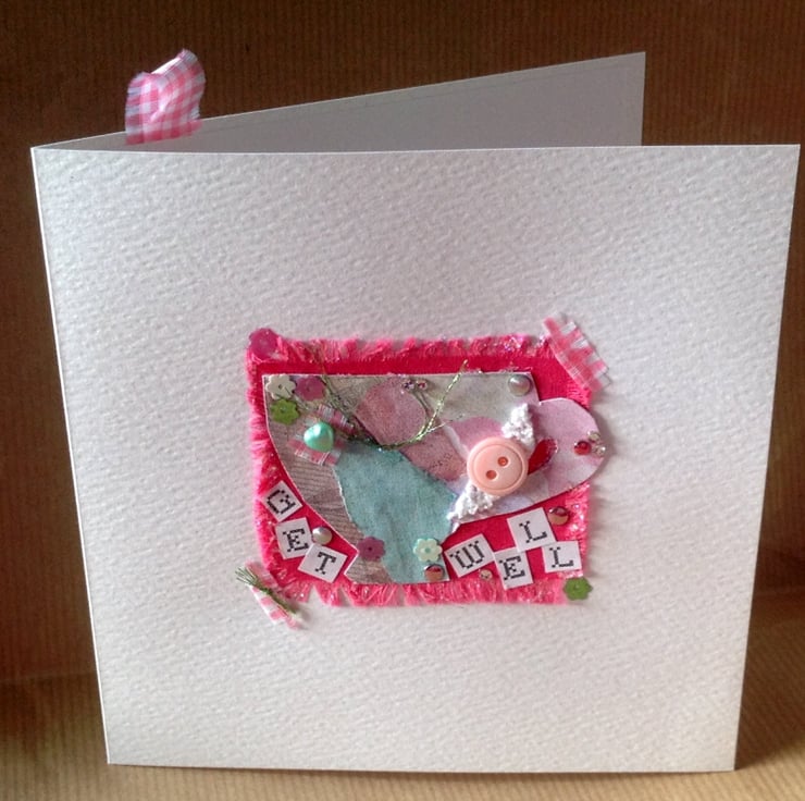 The main design is a cut out shape of a teacup from a piece of my own handmade collaged card which is then placed on a pretty fabric frayed square.