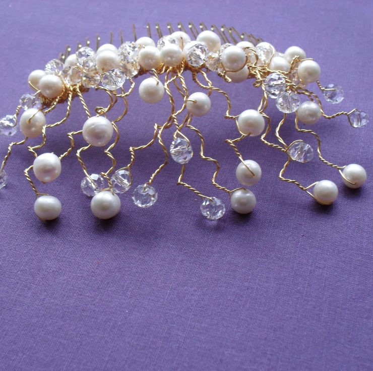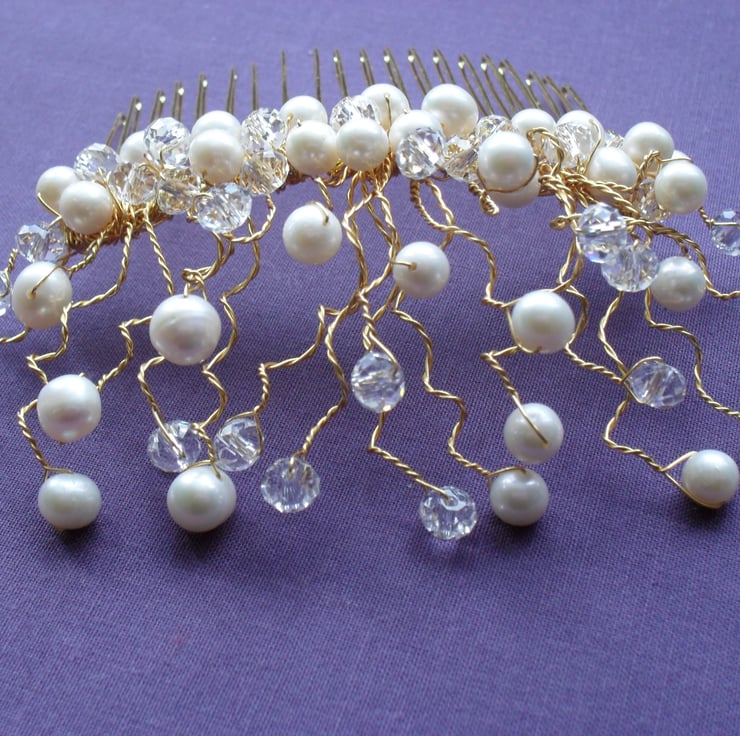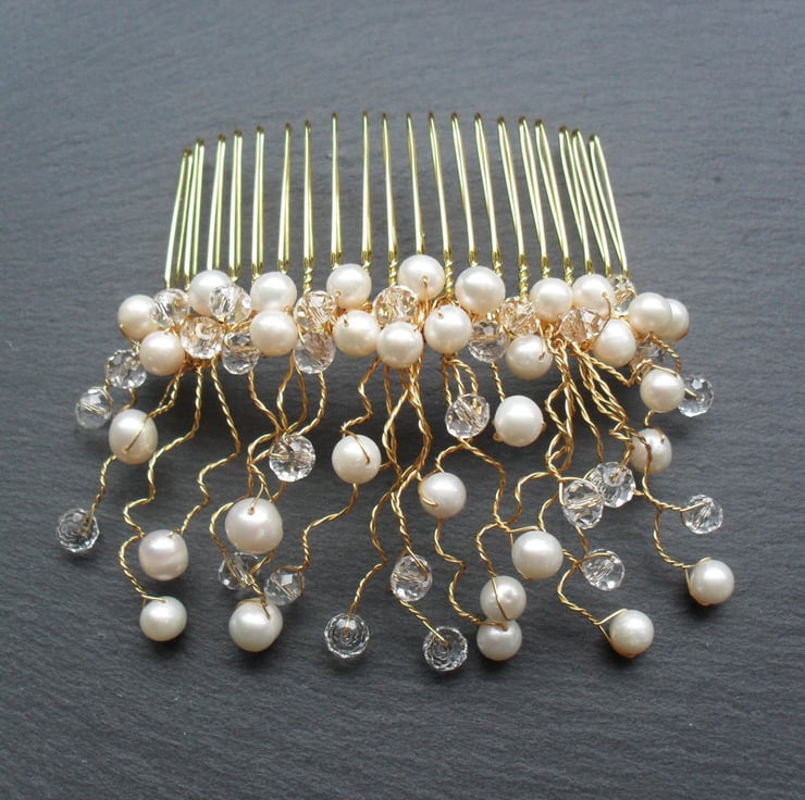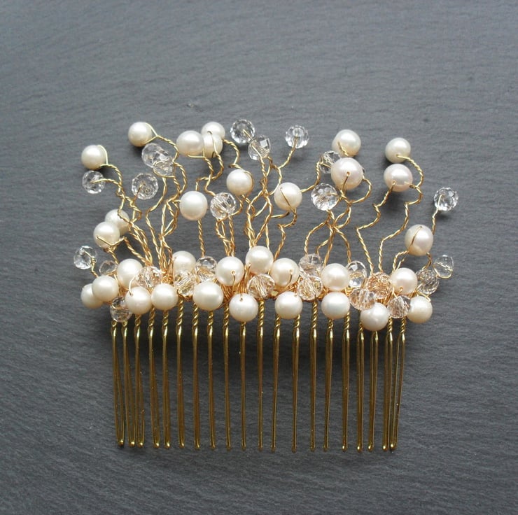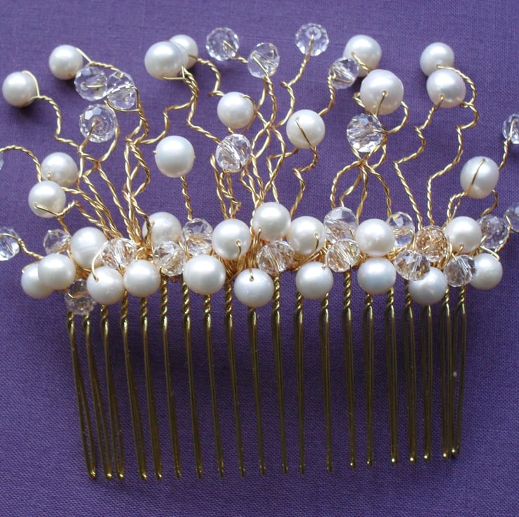 Sale was £19.50 now £12 Ivory fresh water pearls approx. 6 mm and crystals are attached to a gold tone hair comb with gold plated wire .
