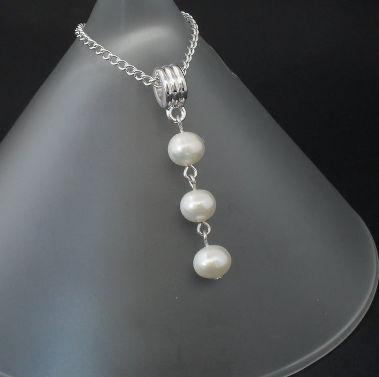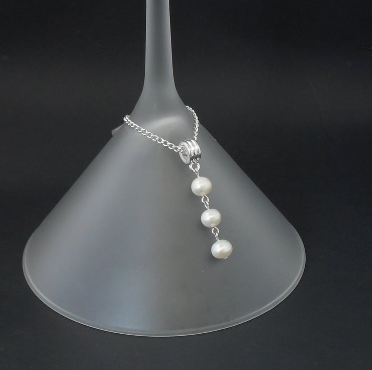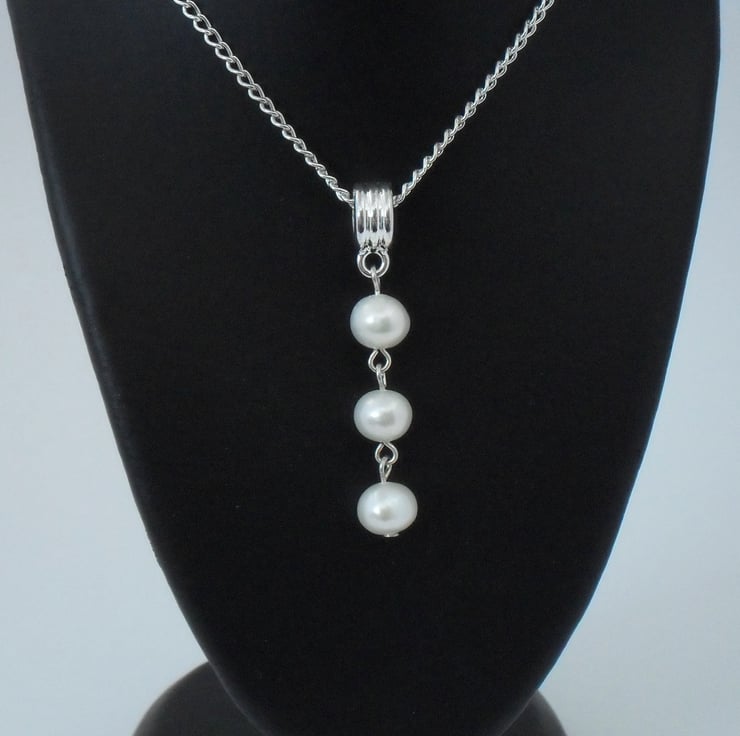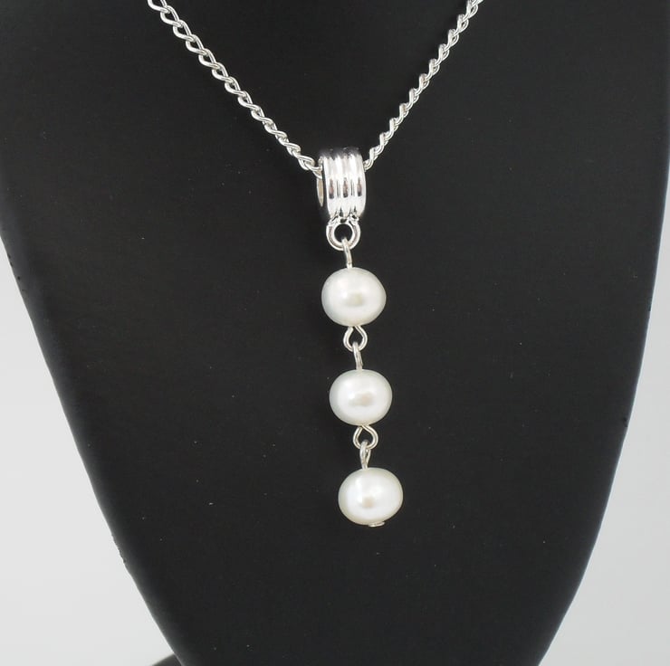 The pearls hang from a simple silver plated bail, on a silver plated chain.