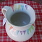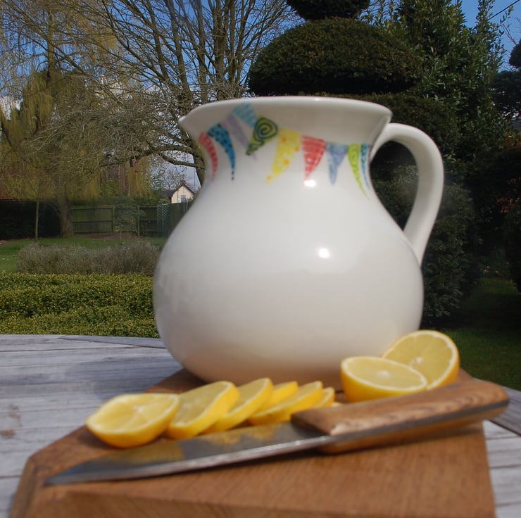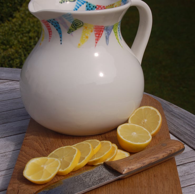 I hand paint each one of my endless summer peices individually so they are all utterly unique, though they do match in with other items. The wind blows the bunting over the top of the jug lip and a section of it is on the inside. It is fastened to the jug handle with white string - you can clearly feel the thickness under the glaze. I do so like texture...