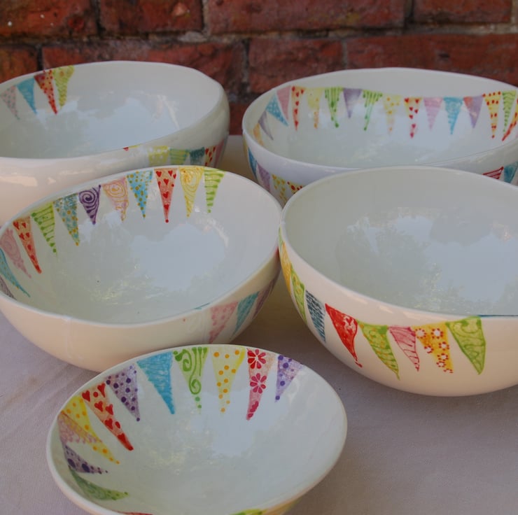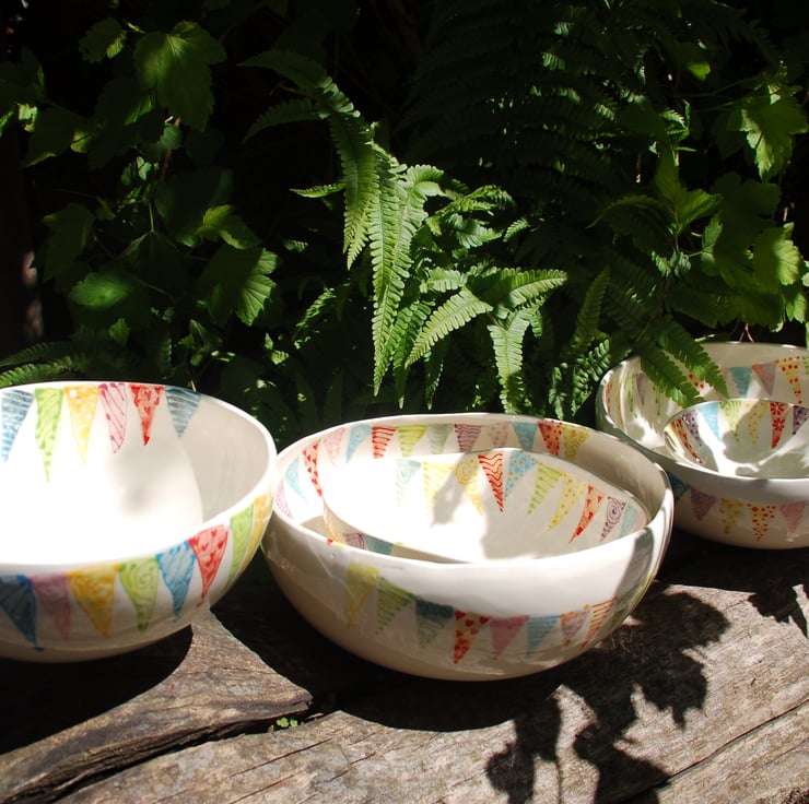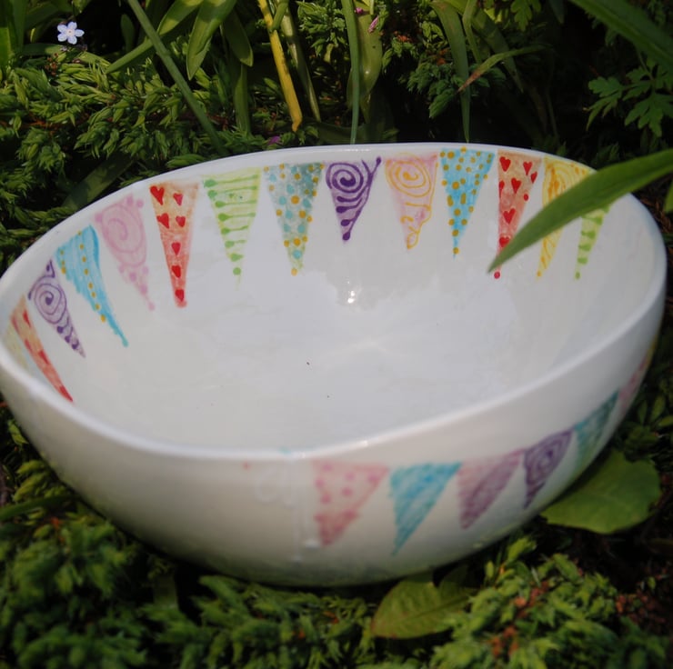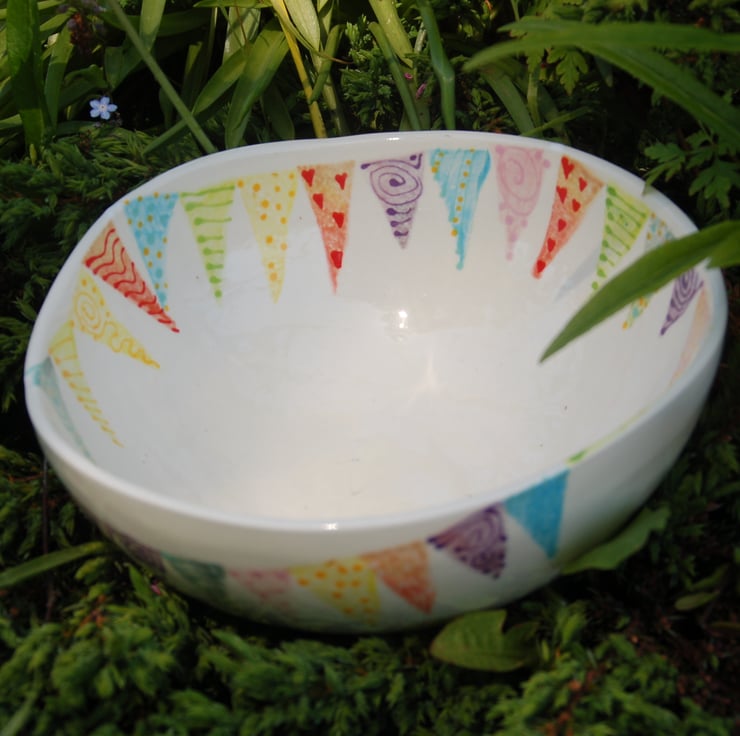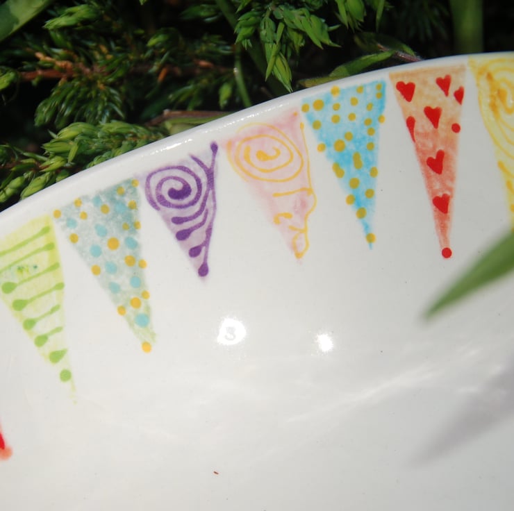 a wavy topped, slip cast, round bottomed bowl. I love this little bowl for its nice shape and size, just perfect for nibbles, crisps or chunks of fruit. I love the way it is not the machined edge of a lot of domestic ware....I love it because it has bunting on!!