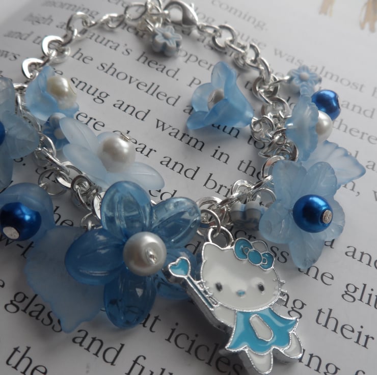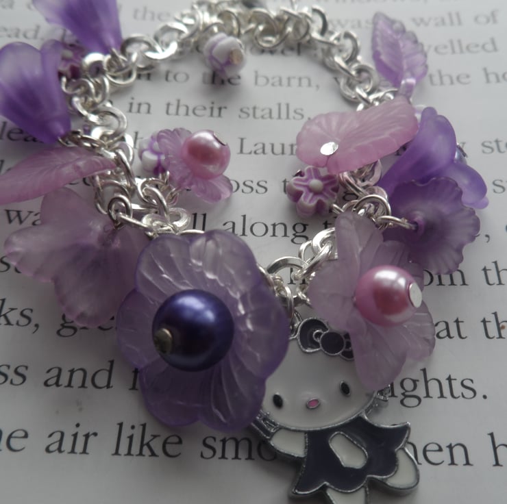 Pretty handmade flower bracelet they can be made in a variety of colours and the bracelet has a variety of lucite flowers & pearls attached on a strong silver plated chain with lobster fastener and a cute Hello Kitty charm attached measure 6 inch can be adjusted to suit comes gift boxed.