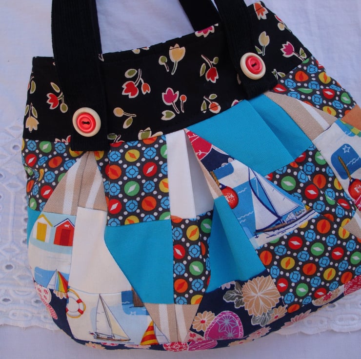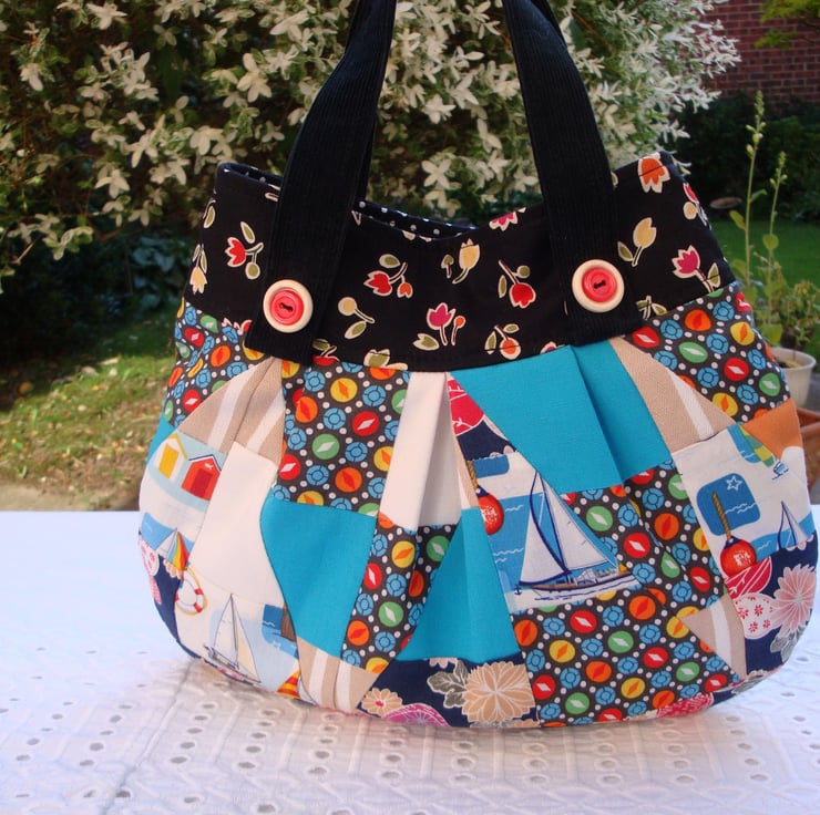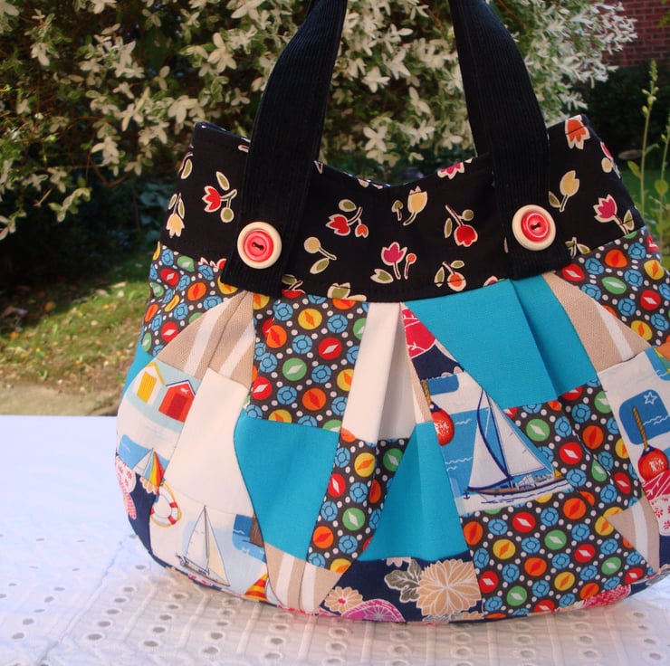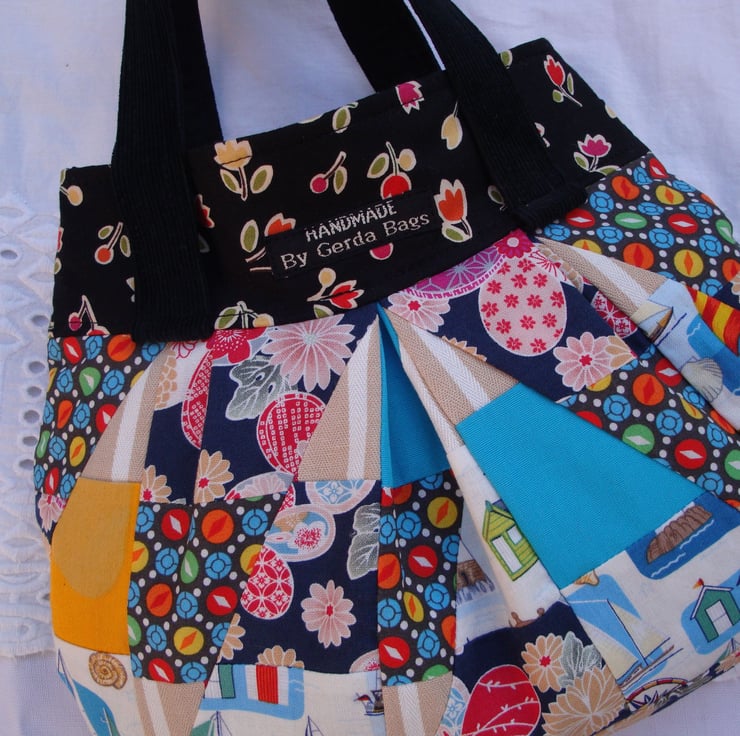 I used various cotton fabrics for the crazy patchwork . Top band/border has been made in a floral cotton fabric from Moda fabrics .