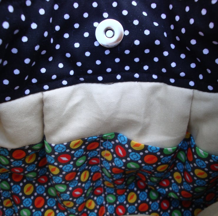 Bag is fully lined in a light beige cotton fabric , with 2 small slip pockets.