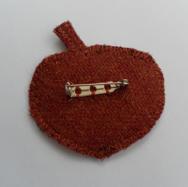 Unique statement, fabric brooch, in the shape of an apple. It measures 8cm x 5cm and has a badge pin sewn to the back.