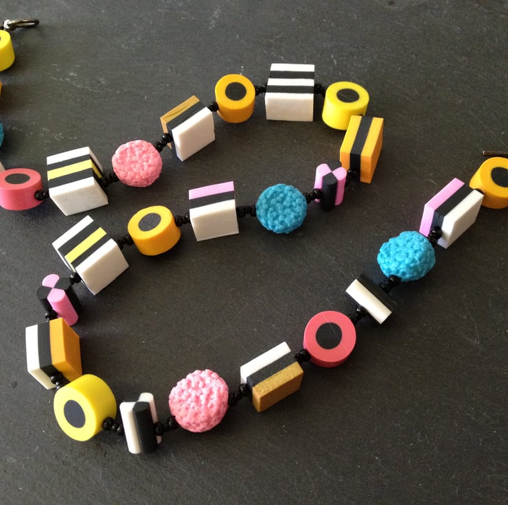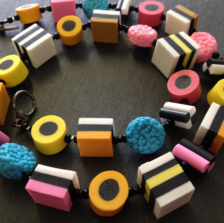 This particular vibrant design is a special edition of my previous liquorice allsort necklace, this time incorporating pink and blue spogs anp pink and black chequerboard sweets. It has already attracted much attention!