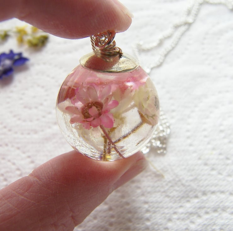 I added these pretty pink and white real daisies to UV resistant, non toxic eco friendly clear resin, took me days of layering the resin to achieve this result and the flowers are mezmerising magnified under the crystal clear resin dome This large orb measures around 25mm, (approx 1") I have capped with a pretty silver cab and hung on an extra long 30" silver plated chain. If you prefer shorter chain message me..