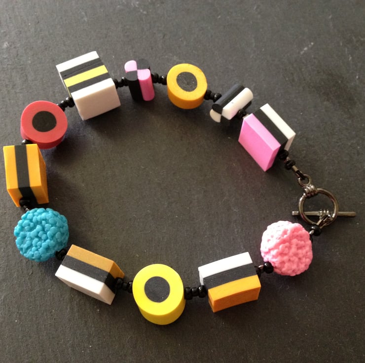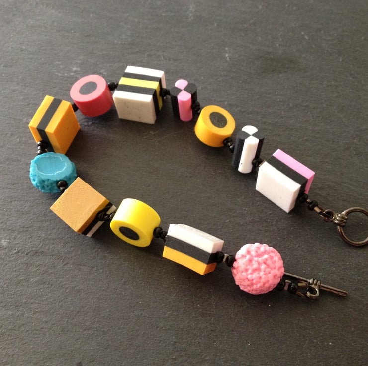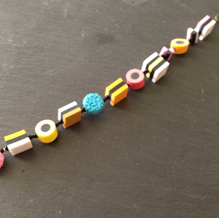 This particular vibrant design is a special edition of my previous liquorice allsort bracelet, this time incorporating pink and blue spogs and pink and black chequerboard sweets. It has already attracted much attention!