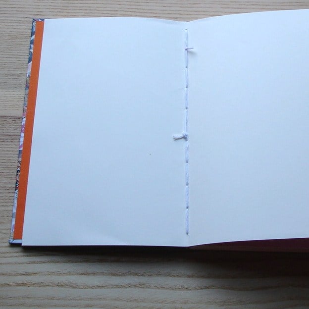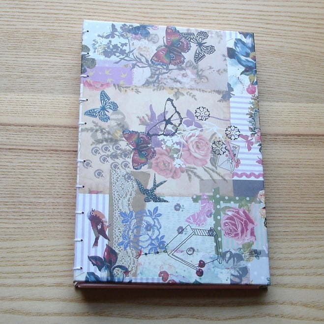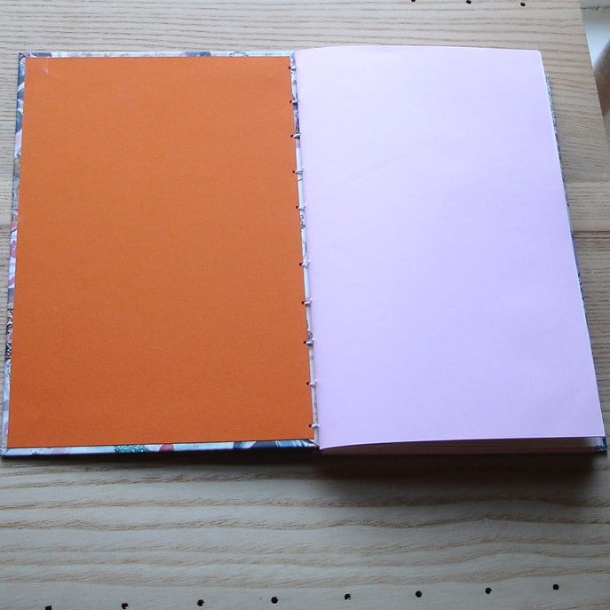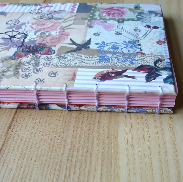New to my little store is this delightful notebook. It has been handbound using lilac/white thread in coptic stitch. The covers are 2mm thick greyboard based, covered in pretty vintage-style paper. The notebook contains 6 signatures of cream conqueror paper, each covered in a sheet of pink paper. There are 5 sheets per signature, making this a 60 page notebook.