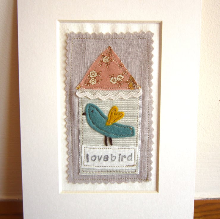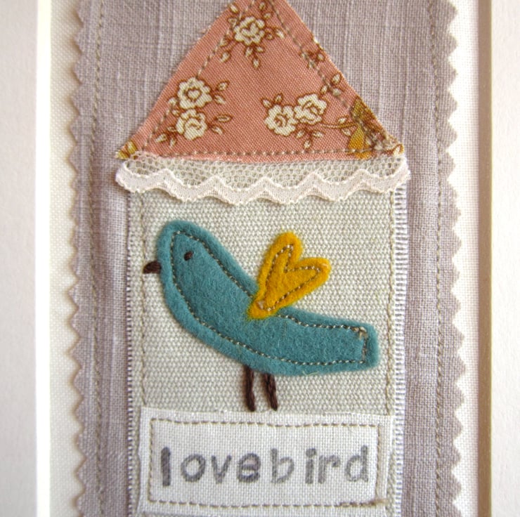 A hand and machine stitched fabric picture with printed wording. Made with cotton and felt and vintage trimmings, this picture is mounted ready to fit a 5"x 7" frame.