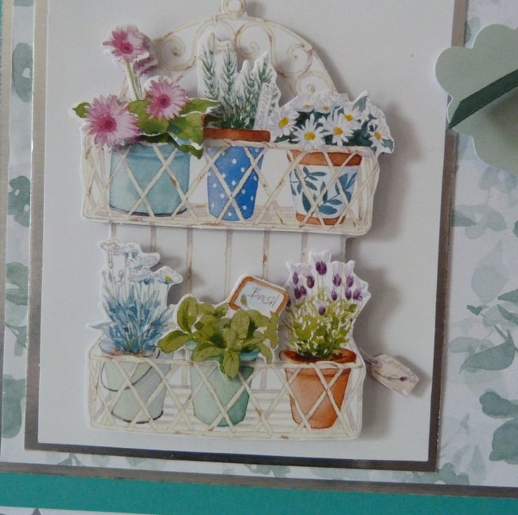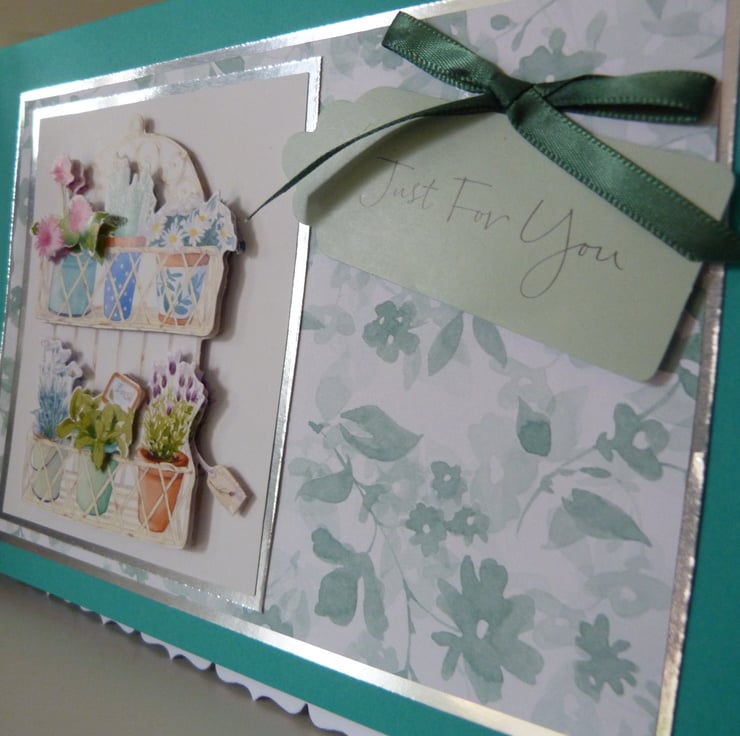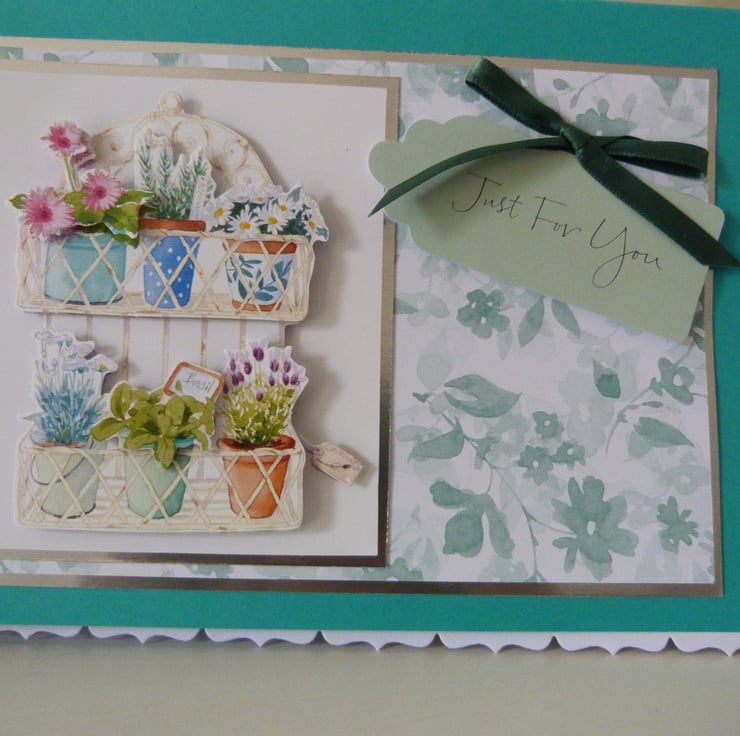 Pretty pots of herbs and flowers which have been decoupaged to give a 3d effect onto silver mirri card, then onto pretty green floral paper then onto silver mirri card and finally onto beautiful jade green card. Finished off with a Just For You tag and co-ordinating green ribbon bow.