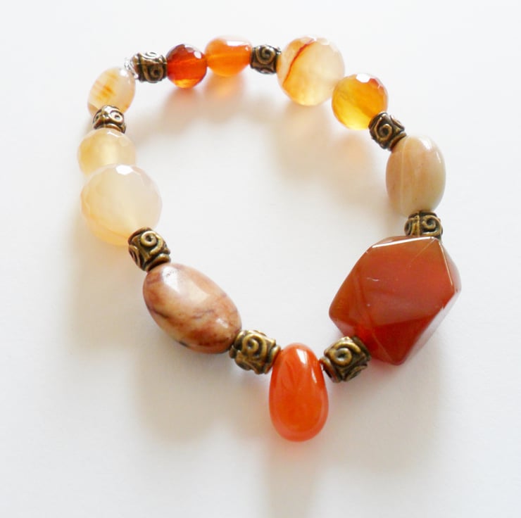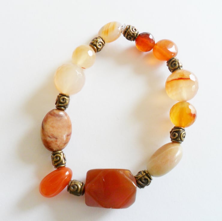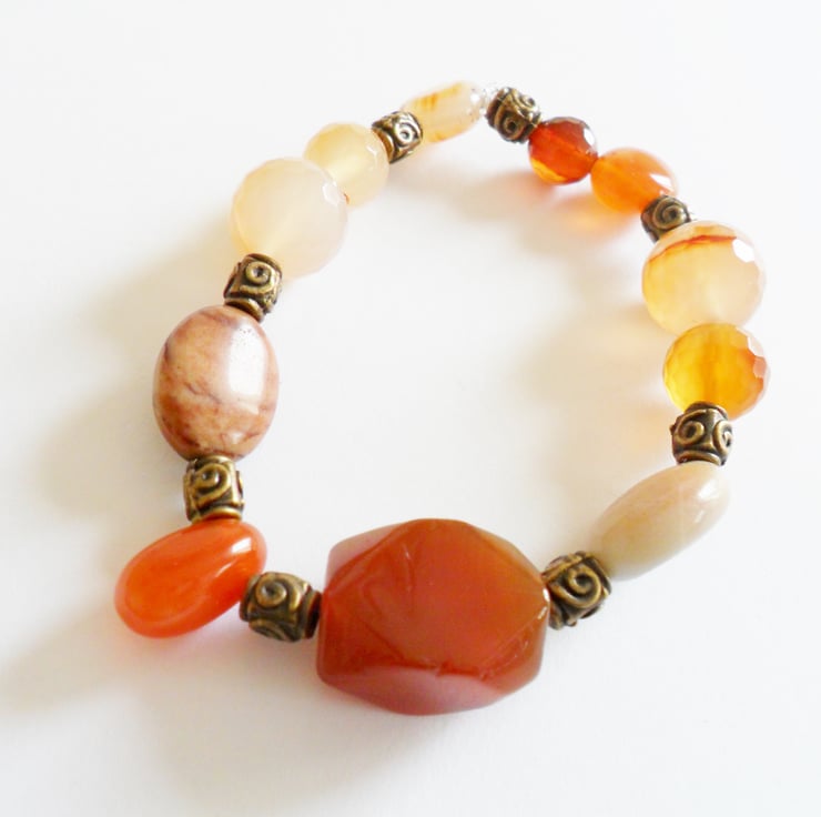 SALE This gemstone stretch. bracelet has all the colours of Autumn.... A large nugget of Carnelian is the focal point, enhanced with luminous moonstone, sandstone and quartz nuggets. Antiqued bronze spacer beads give texture.