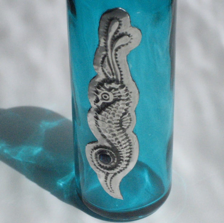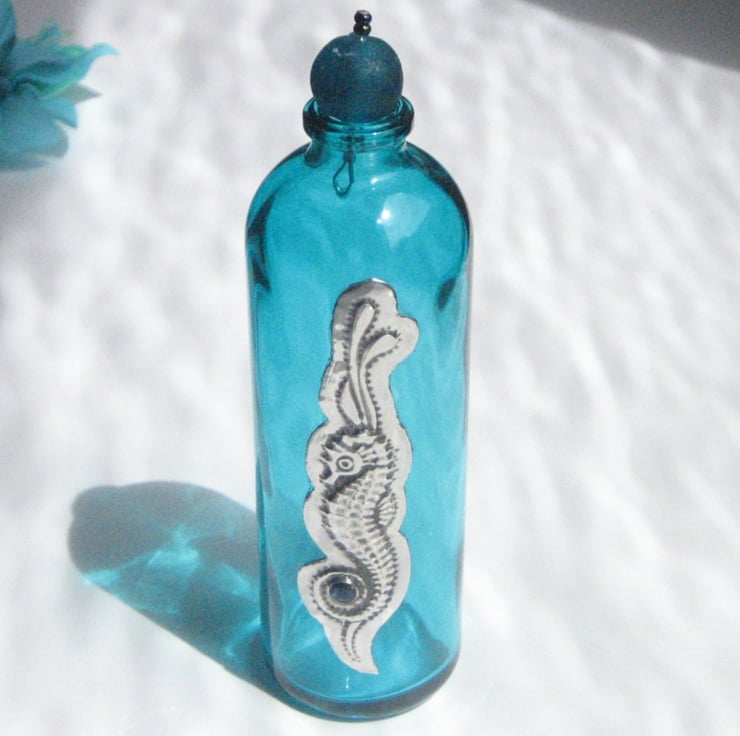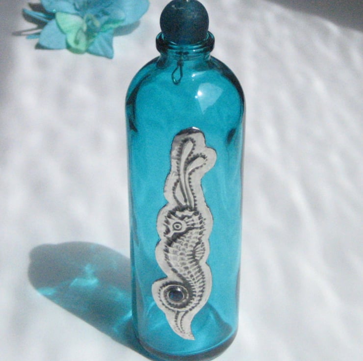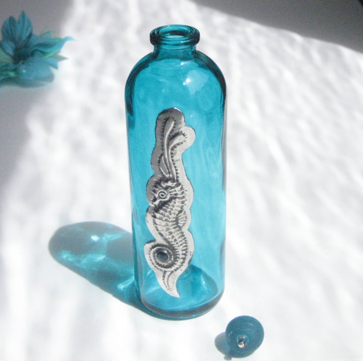 This sweet little turquoise glass bottle has been decorated with a handmade pewter embellishment featuring a blue-green paua shell cabochon. It has been finished with a stopper assembled from glass beads. Perfect for use as a one-stem vase or as a decorative item, it is 13cm high and 4cm in diameter. A great gift for a 10th Wedding Anniversary, Mothers' Day, Valentine's Day, Birthday, Easter or Christmas.