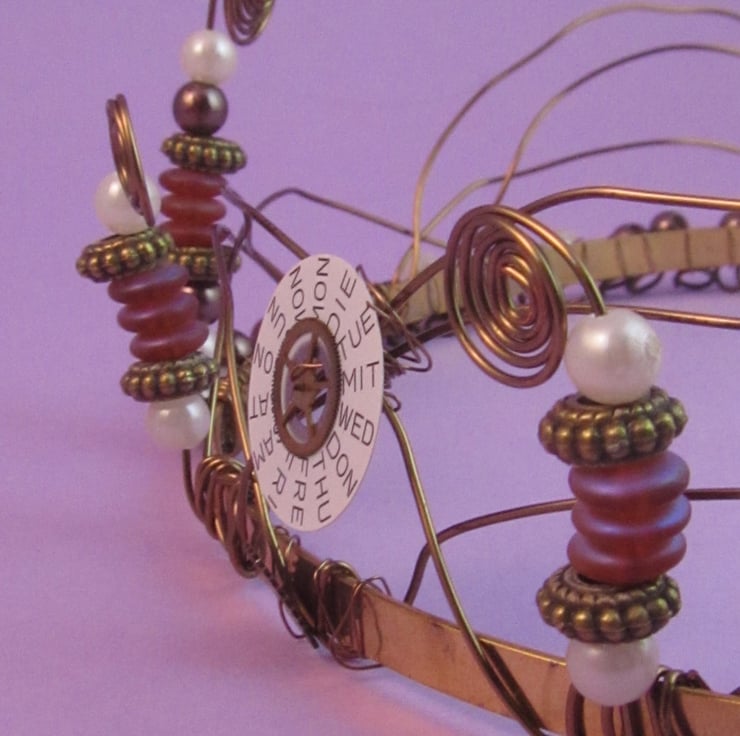 I wanted to create a steampunk tiara. Steam punk is a style based on a literary genre where Victorian England has our technology but it powered by steam and valves.