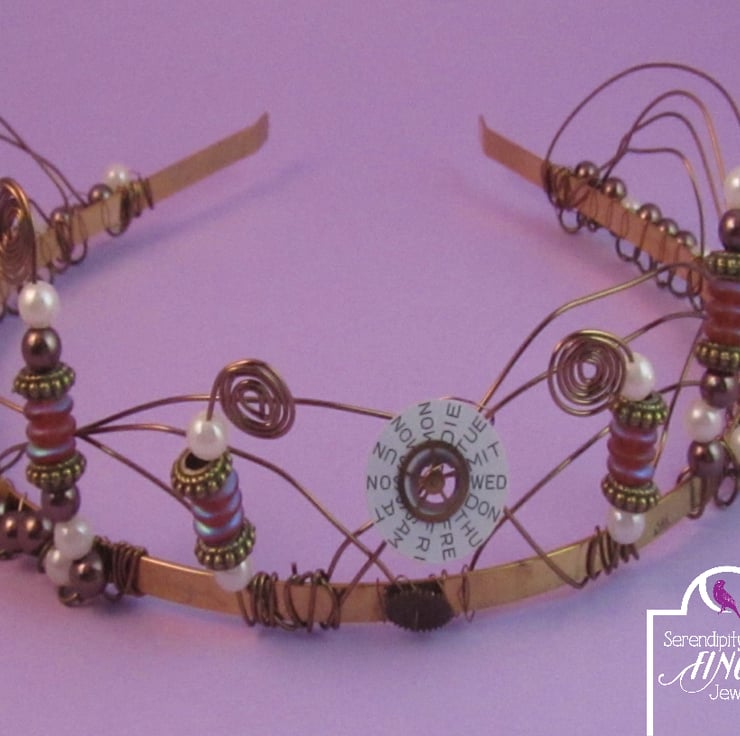 This is a beautiful steampunk valve brown and white gold coloured tiara for weddings or prom. The decoration is 2 inches (5 cm) high from the tiara band. The tiara would be suitable for brides, or steampunk balls. It is pretty. It is created with coated copper wire, faux pearl beads, pretty plastic rondelles, and old watch parts.