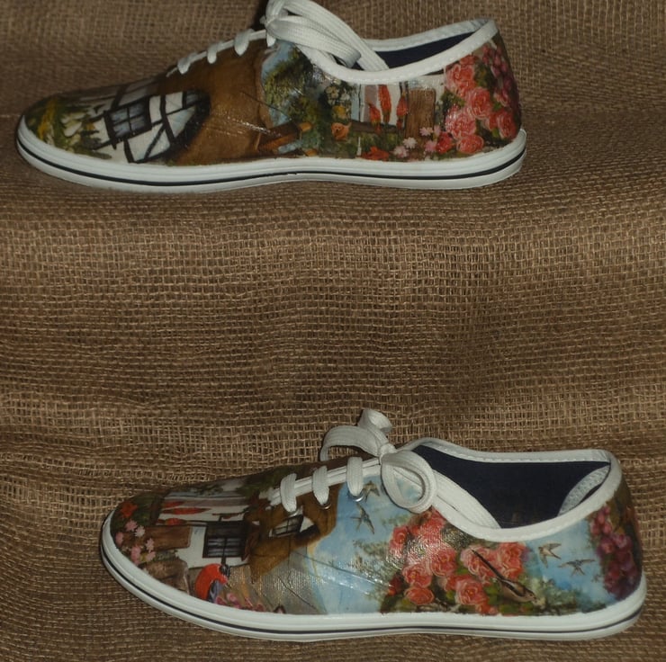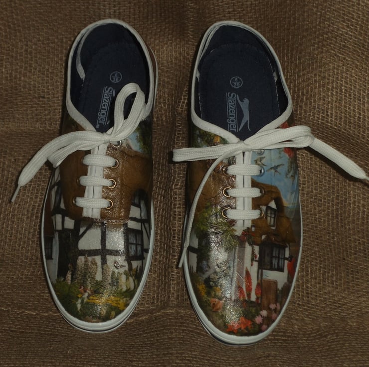 The attractive cottage image goes across the two shoes so that half of the cottage is on one, and half on the other, with garden and flower images on the other parts of the shoes. The shoes are unusual and unique and, whilst I follow the design/pattern as shown on the pair in this photograph, no two pairs will be the exactly the same.