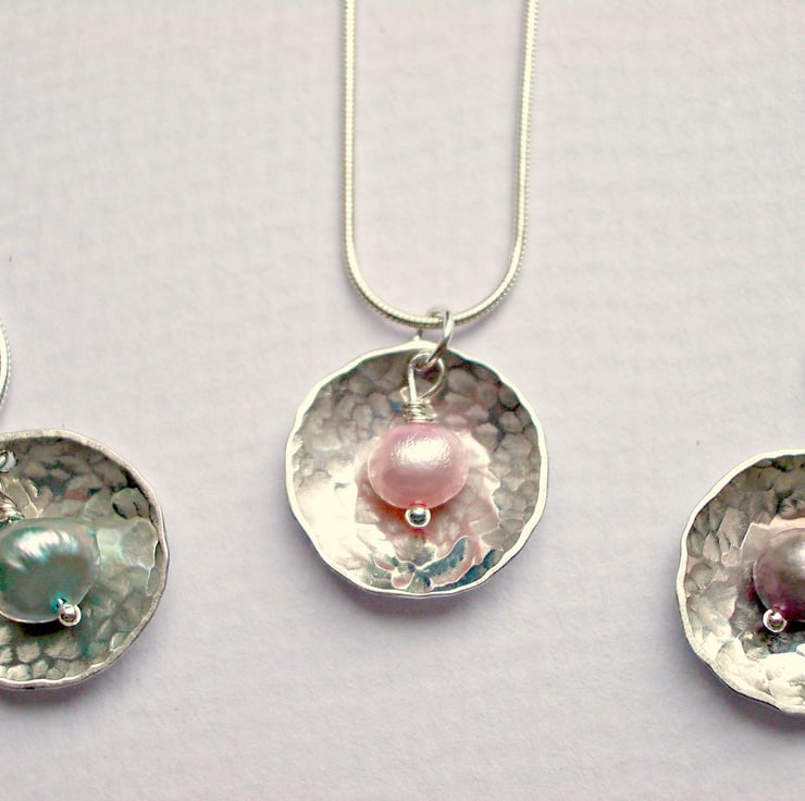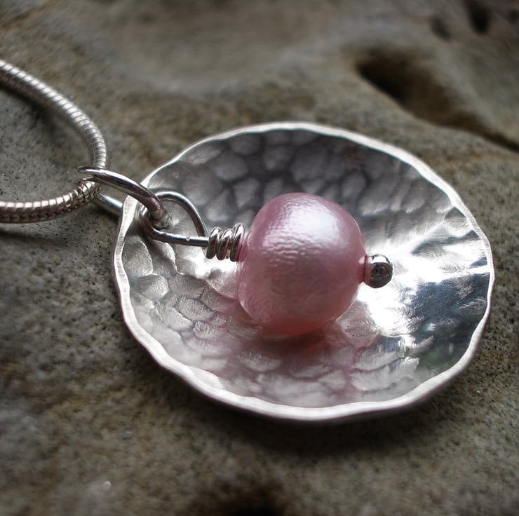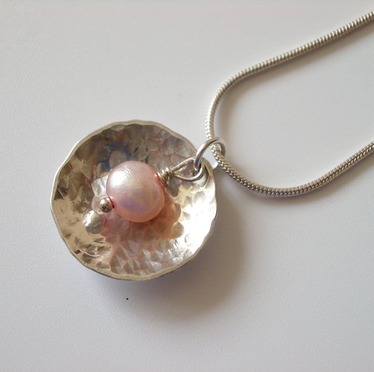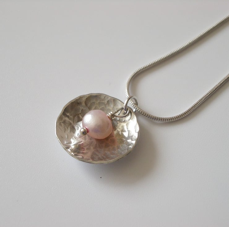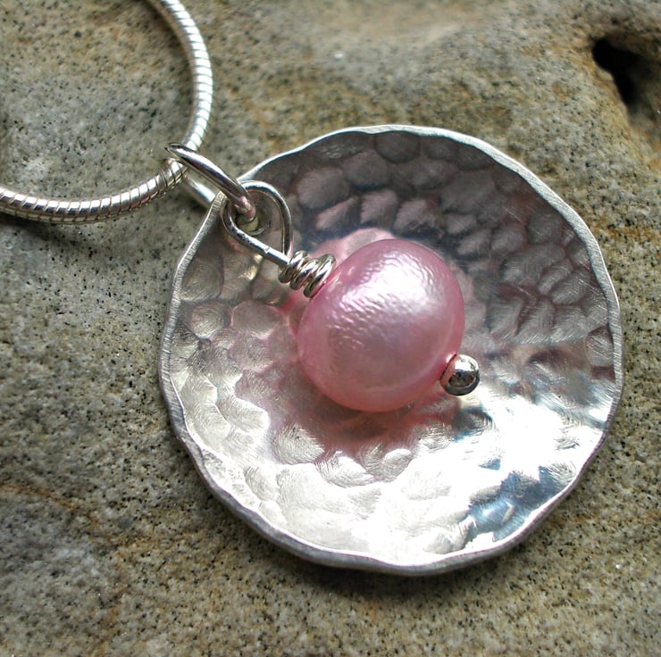 This pendant is hand crafted from sterling silver. I saw pierce the disc and give it a hammered texture. I then dome the silver and add a pale pink freshwater pearl. The pendant hangs from a sterling silver 16" snake chain. If you would like a different length chain, please ask.