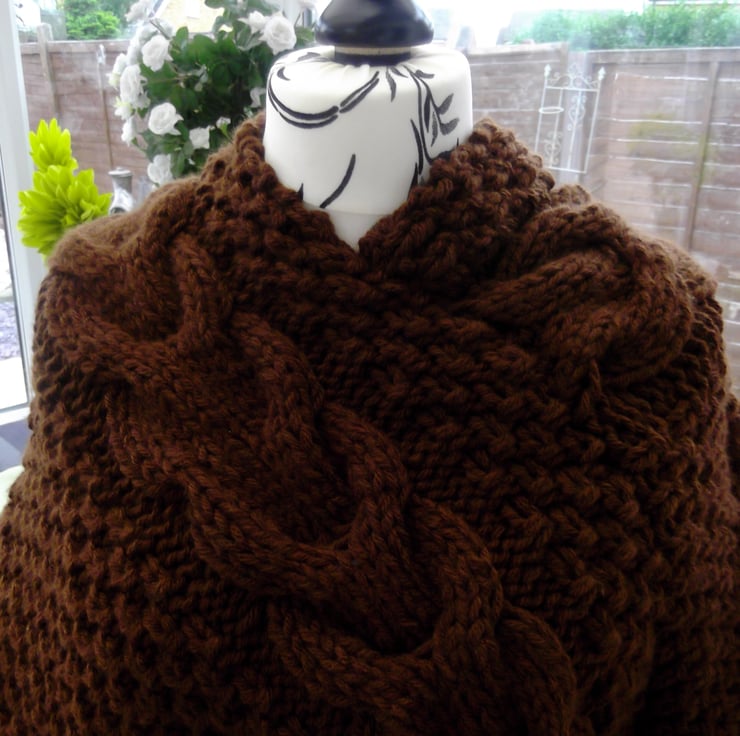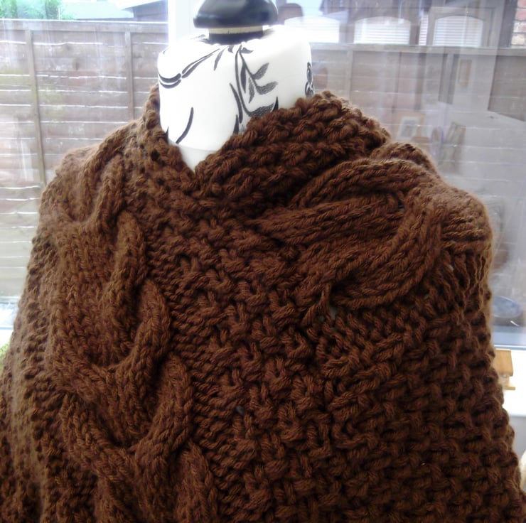 This poncho is knitted in a super chunky winter brown wool,and would be perfect for those chilly days.It has a double moss stitch pattern with a cable design running through it.Back and fronts are the same design. One size fits all.
