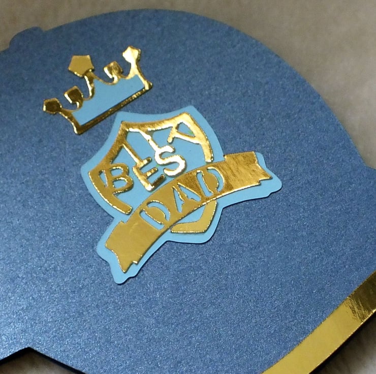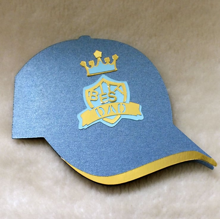 A cute baseball cap shaped card with a die cut badge stating 'Best Dad'. Inside it includes the sentiment 'Happy Father's Day', and is approx. 6"x4" in size at its widest points.