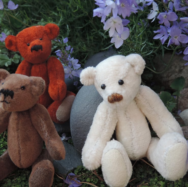 Three sweet little handmade bears. All approx 2.5 inches tall. the red and the brown are made in ultra suede.All fully jointed.These are not toys. Collectors items only. PLEASE STATE COLOUR REQUIRED WHEN ORDERING. White bear now sold.Brown Sol. RED ONLY!