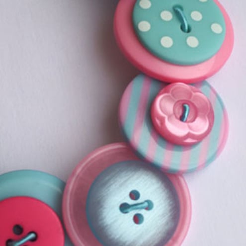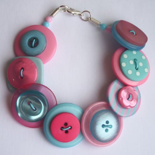 This distinctive button bracelet is rich with an assortment of turquoise and pink buttons. These are threaded onto jewellery wire, which secures at the end with a silver plated lobster clasp fastener.