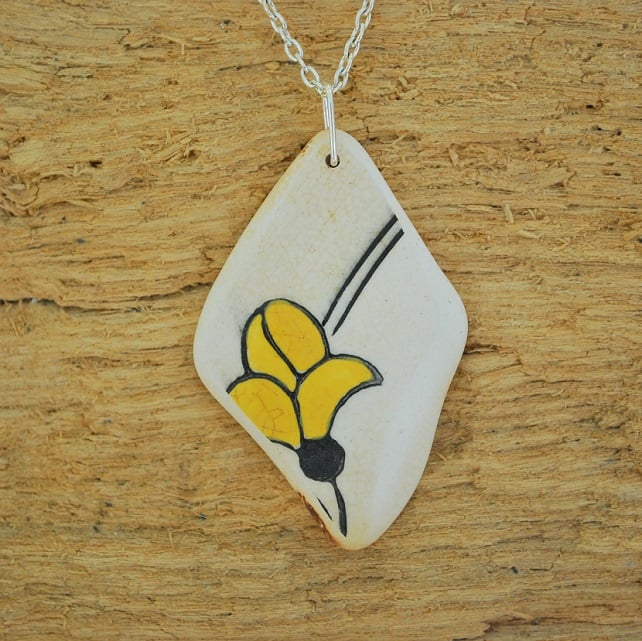 This is a very unusual piece of beach pottery as it is yellow and hand painted within a black outline transfer. The transfer was smudged at the time of manufacture. We have tumbled the edges of the pendant to round them, but otherwise it is as we found it. The pottery is quite cream with cracked glaze and iron staining on the lower left edge. These give it a feeling of age and history.