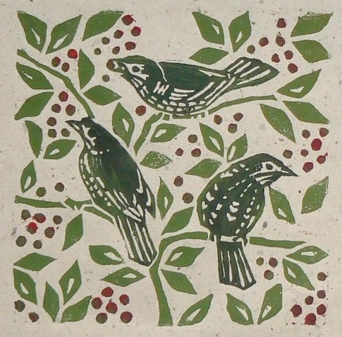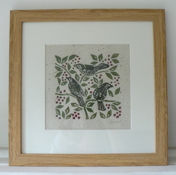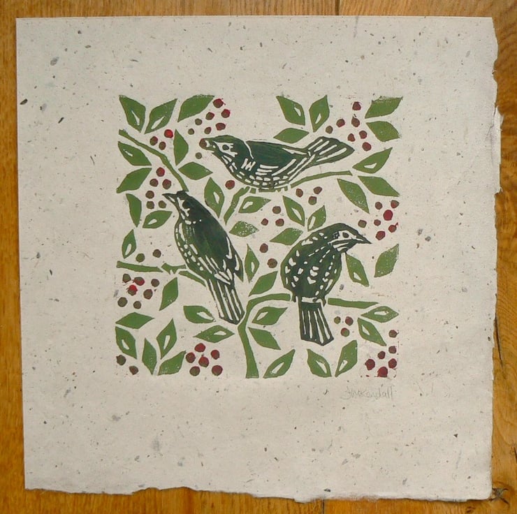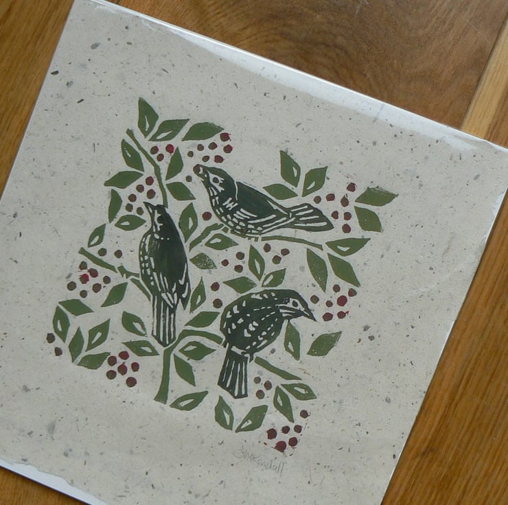 This version of the Fieldfares is hand printed in several colours printed in one layer, onto lokta and hemp handmade paper.