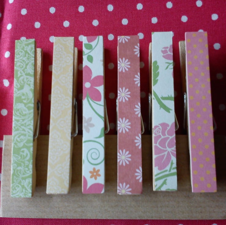 A charming set of 6 decoupaged wooden pegs with magentic strip attached to the back of them. The paper used is scrapbook paper from a range called Tea Party of pretty pinks and greens.