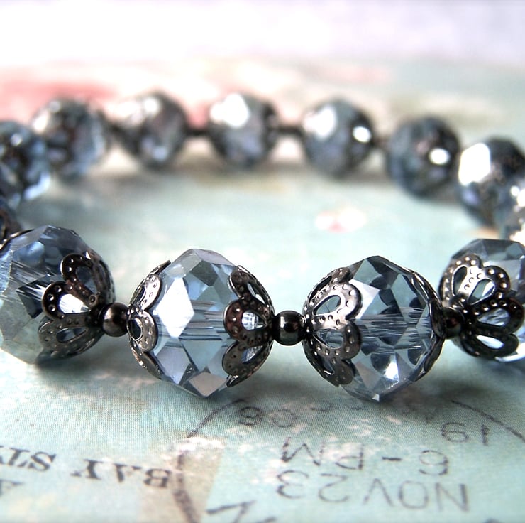 The lovely crystal beads are a very pale grey-blue, with a shiny plated finish.