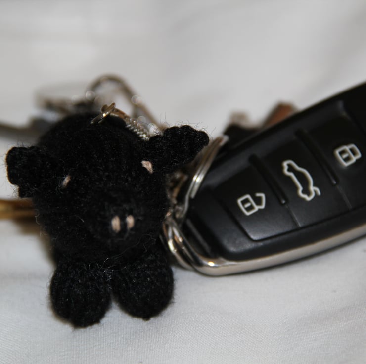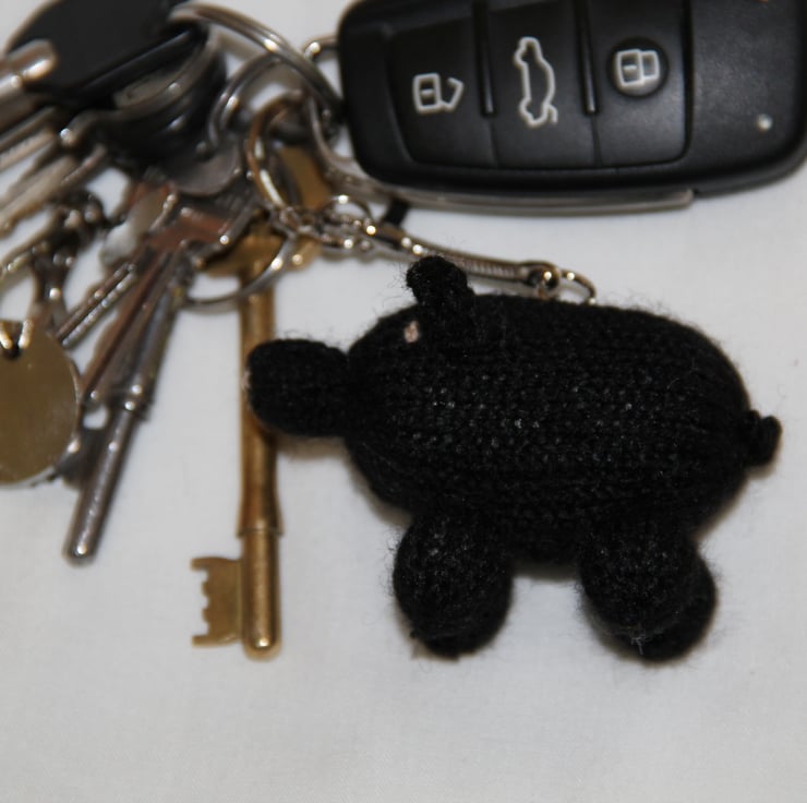 This little piggy key ring is very versatile! Have one on his own on your bunch of keys or hang from a school bag. Each piglet is 7 cm long and 5 cm tall. Apart from the key ring itself, this piggy has no sharp or loose parts; everything is stitched. Because each one is knitted individually, your piglet will be unique.