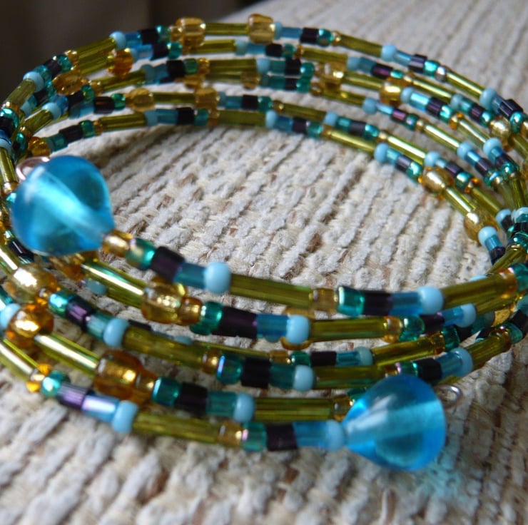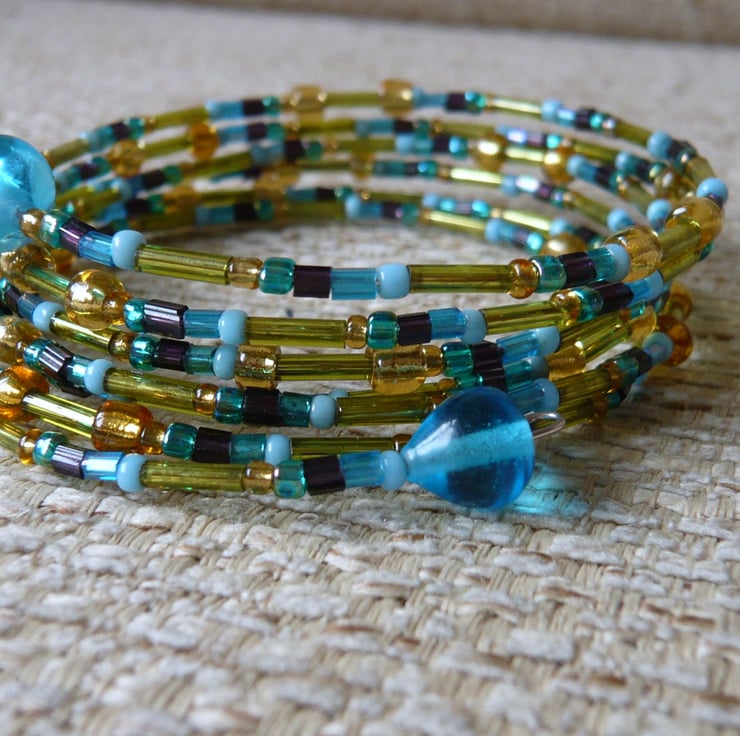 Approx 5 full coils of beautiful seed beads . blues, greens, golds and purple. At each end there is a small tear drop blue bead.