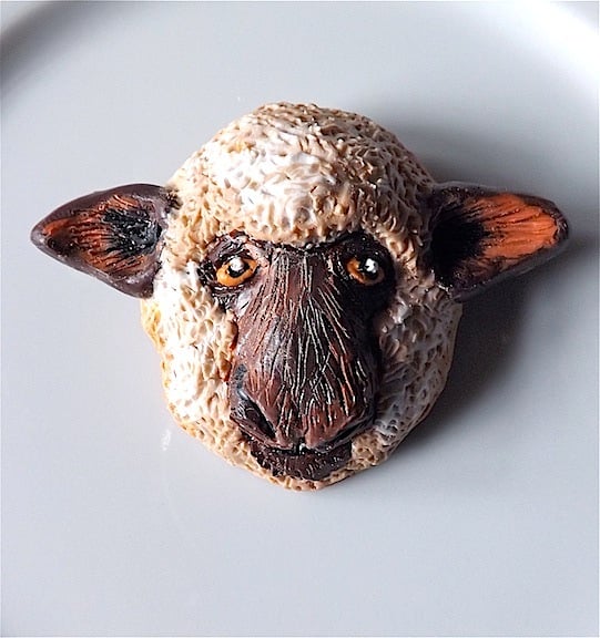 Rare breed sheep brooch or badge , DORSET DOWN RAM, ( Harry ) original sheep brooch in fired polymer clay, sheep hand made in my studio, in fired polymer clay, hand polished and varnished, size of brooch 70 X 53 mm ( 7 X 5.3 cm ) 25 mm deep, brooch safety fastening silver plate. Please note this is a one off hand made original and has not been cast from a mold.