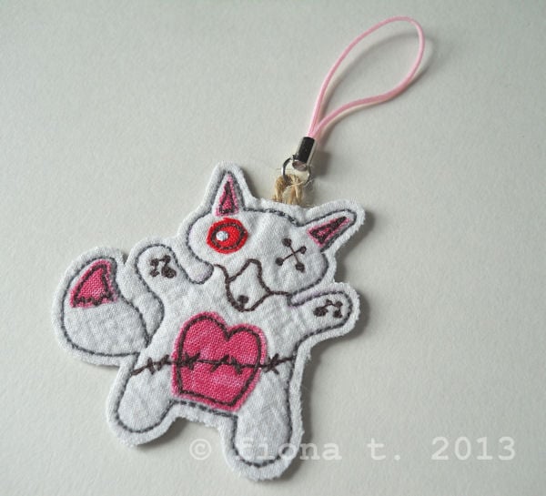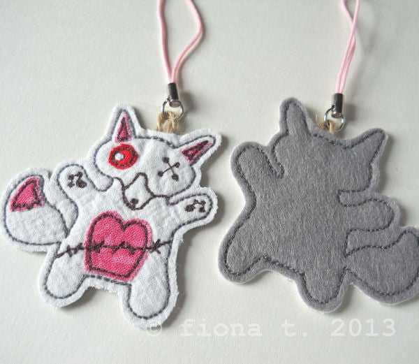 they hang from a pink mobile phone strap, attached to a twine loop which has been securely stitched.
