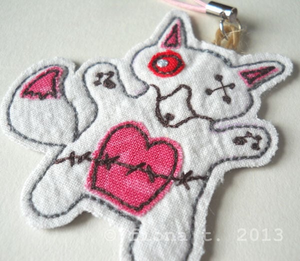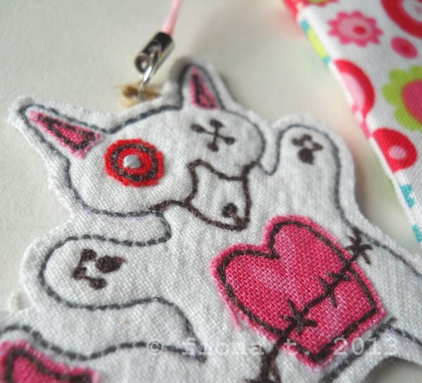 the pink floral printed cotton fabrics are appliqued onto pre-washed calico, and the intricate details are drawn freehand with free machine (free motion) embroidery. its single eyeball is hand embroidered.