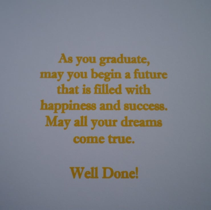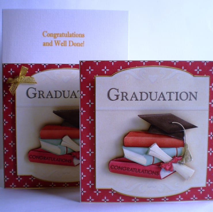 A small card measuring approximately 145x145mm (5.75x5.75in) suitable for a male or female graduation. It is a decoupage /3D effect image. Insert is white with a verse. I have also made this on a larger card which would be more suitable if it was to be personalised. It is listed separately