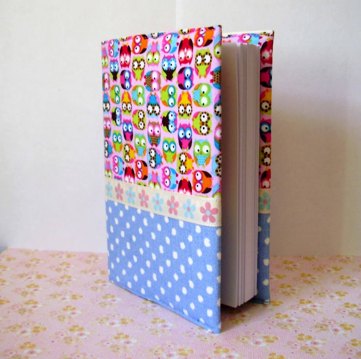 This is an A6 notebook, with good quality lined paper,it has been covered with two fabrics, one featuring pretty little owls, and the other a toning spot print, with the addition of a pretty ribbon. It is interfaced and lined in plain cream, the cover can be removed, and a replacement notebook fitted when needed.