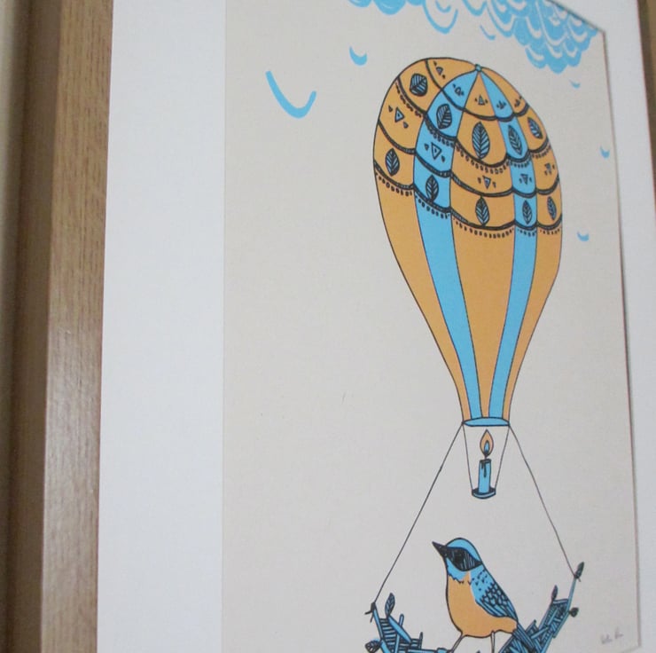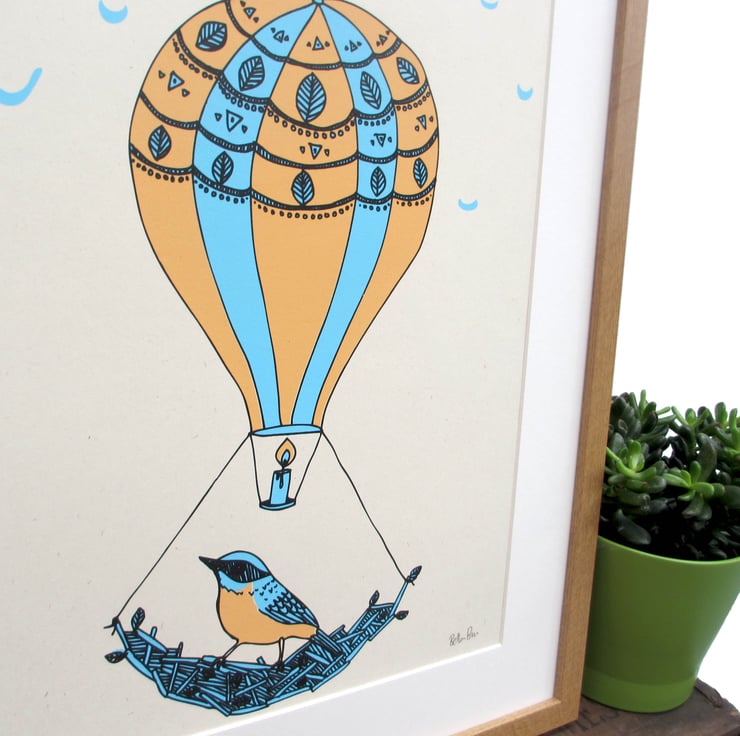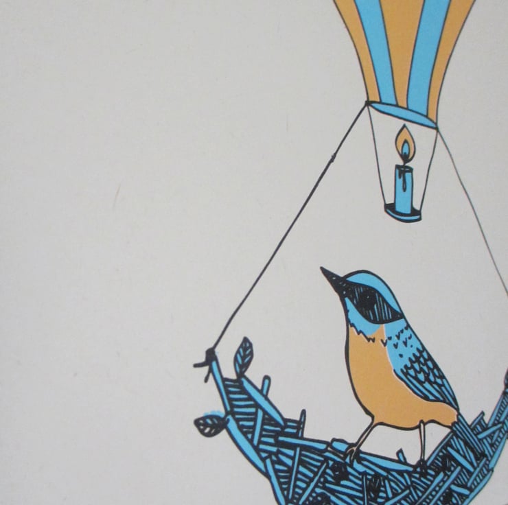 A Three colour screen print featuring a bird on the move in a hot air balloon. Inspired by the hot air balloons flying above my home city of Bristol.