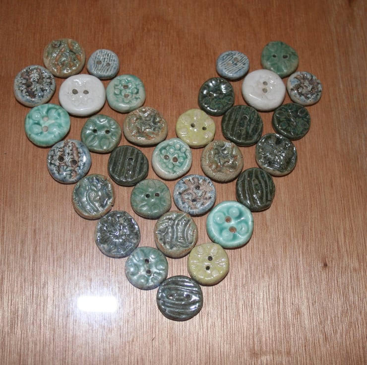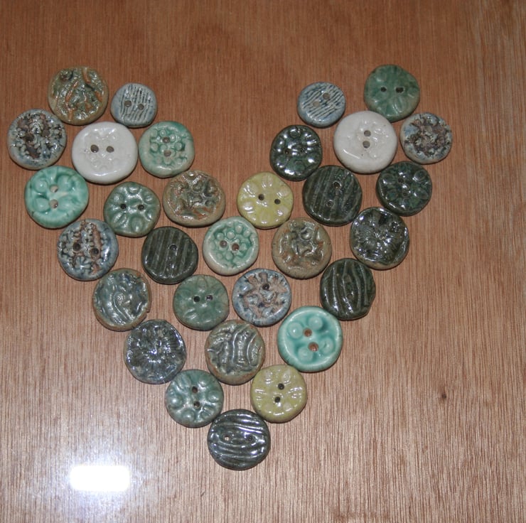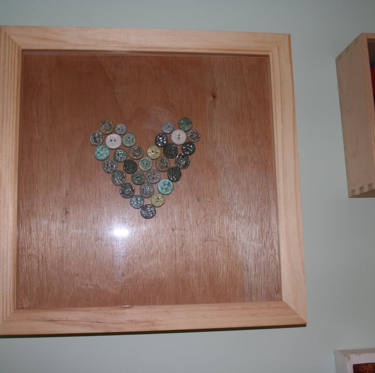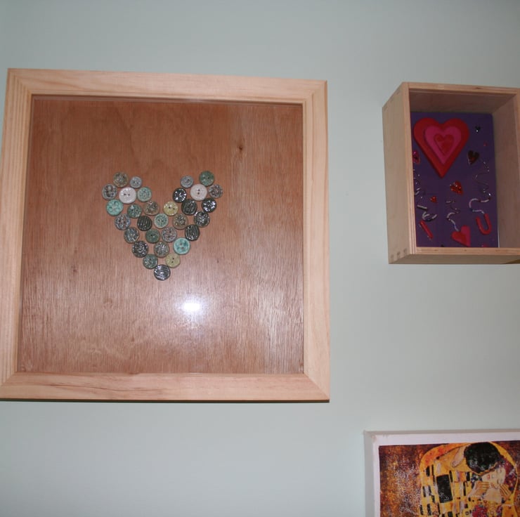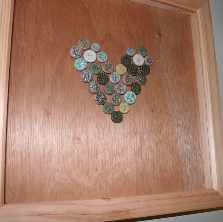 Wooden picture frame containing one large heart design made up of small individual textured handmade ceramic buttons. Each handmade ceramic button has a different texture impressed into the surface and then a different colour glaze applied. wooden back drop.