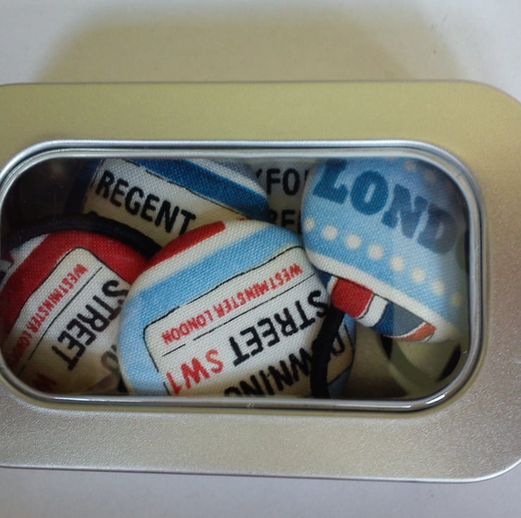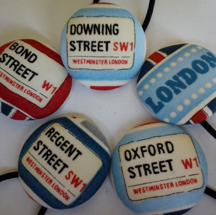 A set of 5 fabric covered button bobbles featuring famous London streets- Regents Street, Oxford Street, Downing Street, Bond Street and one saying London. Each button measured 45mm across and had a snag free black bobble attached. Great for making a statement! Suplied in a rectangular metal tin, so perfect for giving or treating yourself!