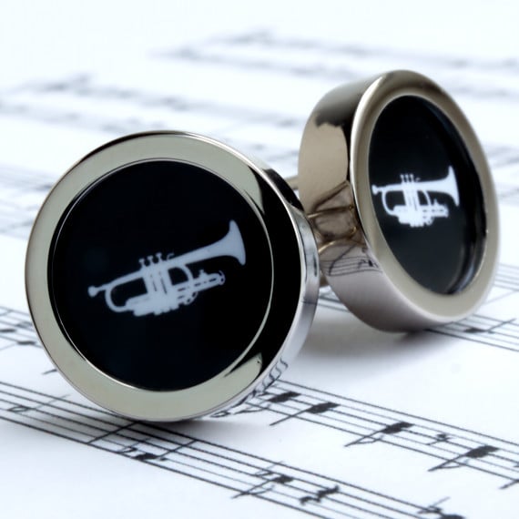 Trumpet cufflinks pictured with a white instrument silhouetted on a black background. These cufflinks also look great in black with a white background.