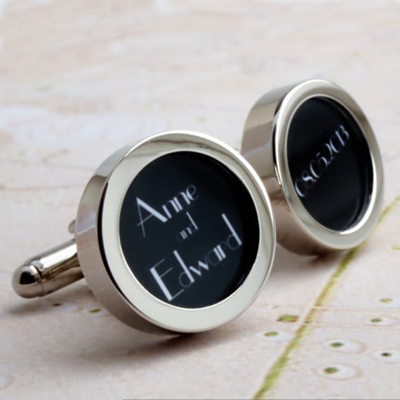 Custom Art Deco cufflinks for the groom with the names of the bride and groom on one cufflink and their wedding date in words on the other. The lettering is a 1920s Art Deco font, white letters on a black background. Part of a range of cufflinks for all of your wedding party.