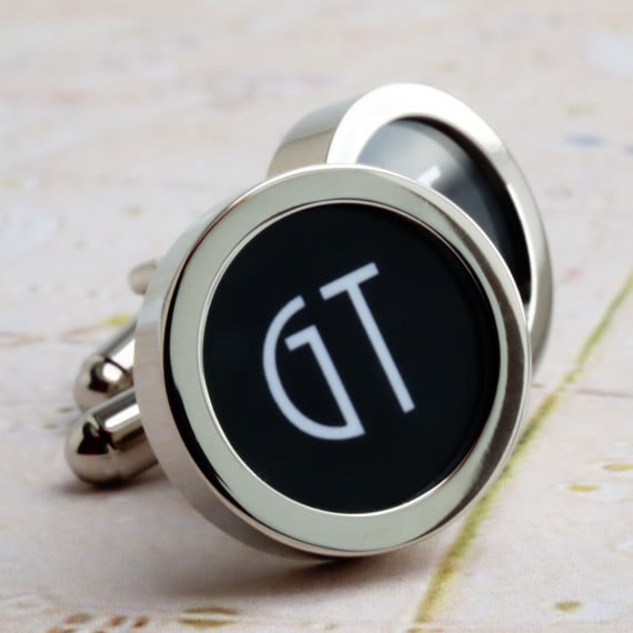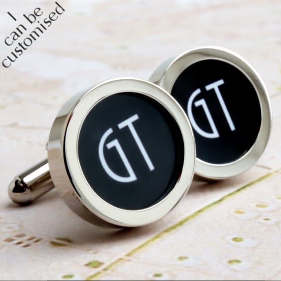 Monogrammed cufflinks in a 1920s style with 2 initials in white letters on a black background. Also available with black letters on a white background or your own custom colour.