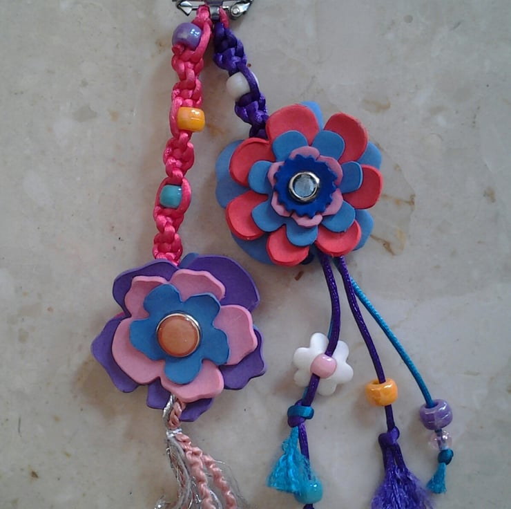 To make this pretty bag charm I have used two colours of pretty silky braid using beaded twist macrame for hanging the flowers.